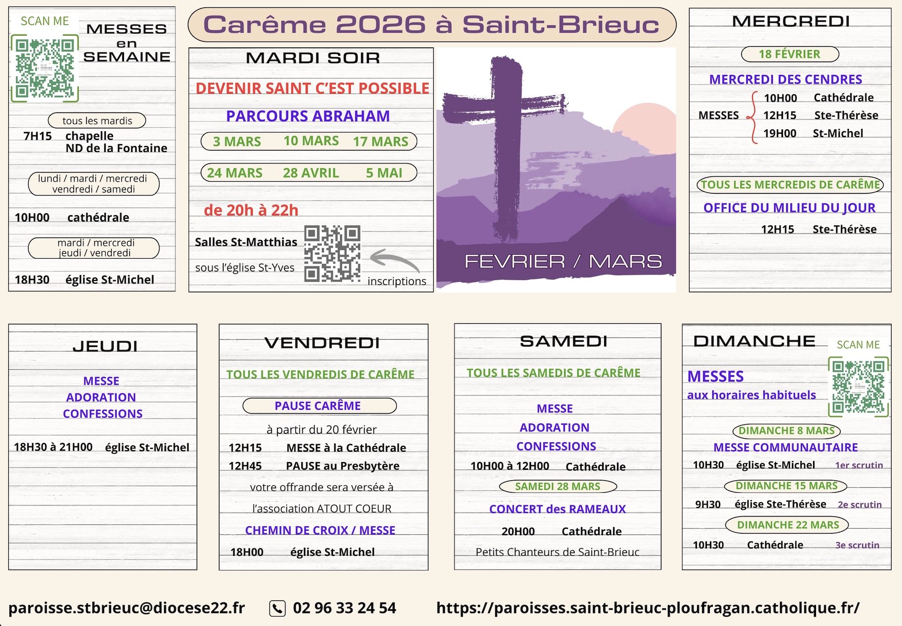 - Dimanche 15 mars 2026 : 9h30 église Sainte-Thérèse / 10h30 Cathédrale / 11h00 église Saint-Yves / 18h00 église Saint-Guénolé
